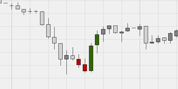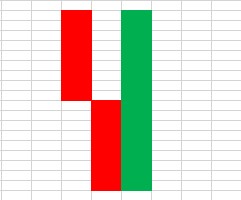 Dit voorbeeld kaarspatroon nummer 2. Een grote, bullish kaars die gevolgd wordt door een grote, bearish kaars, die ongeveer even groot is.